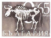at bottom right. On the stamp and on the reverse museum items, including fossil