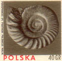 fossil on stamp with printed perforation. Fossil brachiopod at lower left, otherwise blank.