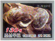 fossil on stamp with printed perforation. Four korean characters at top, vertical centre line. Fossil crab on the reverse.