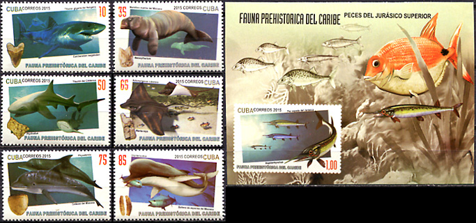 | 'FAUNA PREHISTORICA DEL CARIBE', 10 c., Carcharodon megalodon, 35 c., Metaxytherium, 50 c., Ptychodus, 65 c., Aetomylaeus cubensis, 75 c., Physeterid, 85 c., Orycterocetus; M.S., 1,00 P. (imperforate), Aspidorhynchus. The large orange fish at top right of the sheet margin is Gyrodus (thanks Dimera). Issue date: ? The date 6-5-2015 on the FDC cancel is not the date of issue.